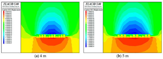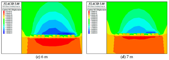 Vertical displacement cloud for (a) 4 m, (b) 5 m, (c) 6 m, and (d) 7 m.