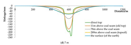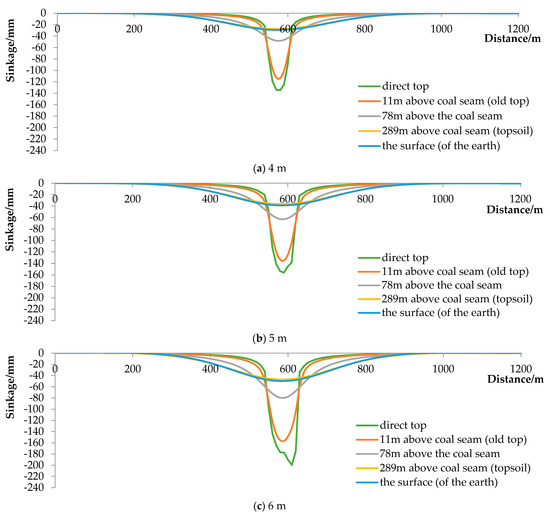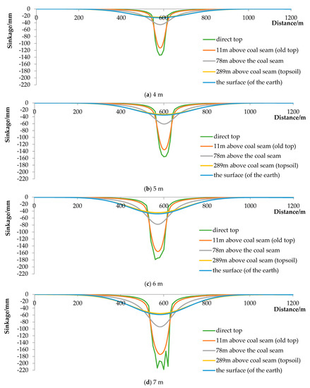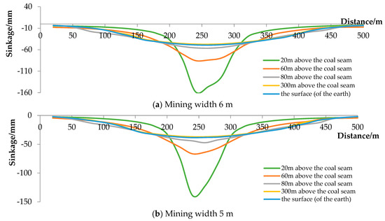 - The subsidence of the surface was still synchronized with the subsidence of the topsoil layer 300 m above the coal seam, the increase in the subsidence of the topsoil layer was less than the increase in the subsidence of the rock seam, and the influence of the mining width on the surface was gradually obvious as the mining area increased.