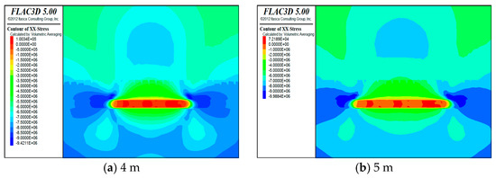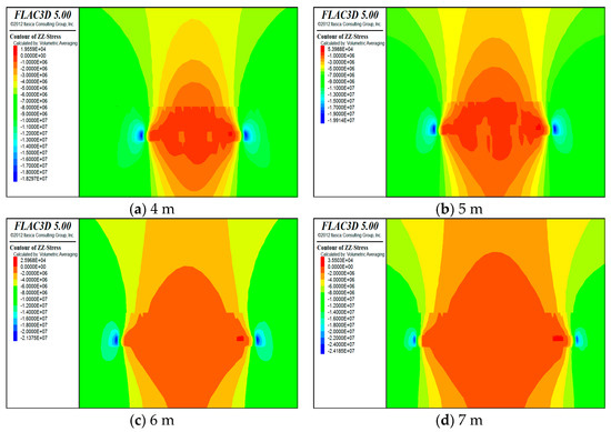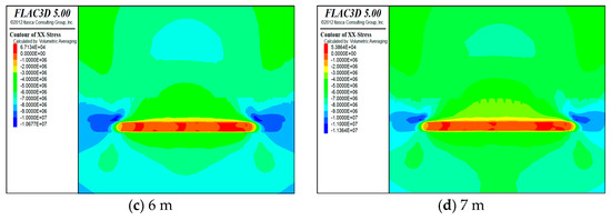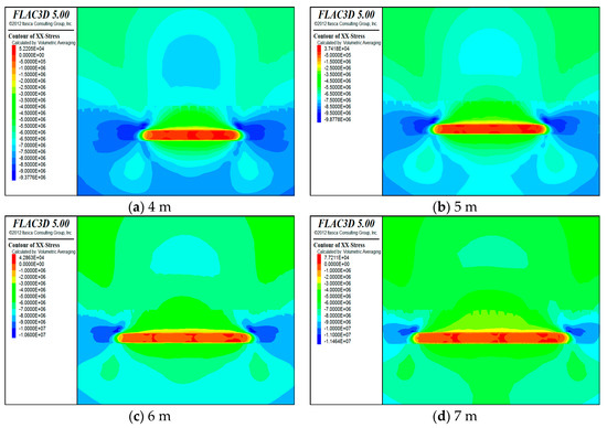 Horizontal stress distribution cloud for (a) 4 m, (b) 5 m, (c) 6 m, and (d) 7 m.
