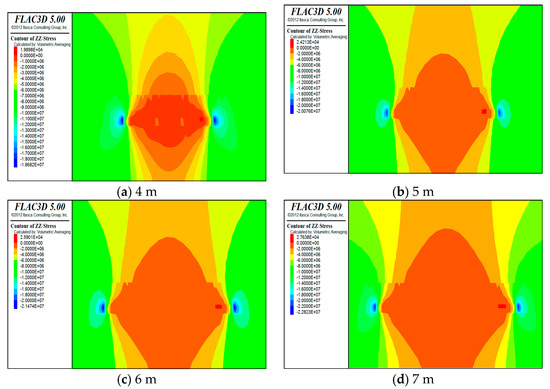 Cloud of vertical stress distribution for (a) 4 m, (b) 5 m, (c) 6 m, and (d) 7 m.