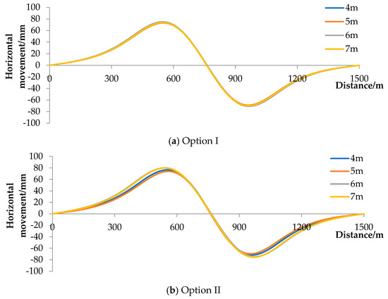 (3) The following conclusions can be drawn from Figure 18 and Figure 19 and Table 6. From the point of view of surface control, the control effect of option I is slightly better than that of option II, both of which can ensure that the impact of mining on surface structures after mining is controlled within the range of Class I. The smaller the mining width, the better the control of surface movement.