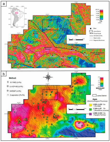 Airborne magnetic and satellite gravimetric maps for the Southern Amazon Craton; (a) Major structures and domains superimposed on the total gradient (TG) of total magnetic intensity (TMI); (b) geochronological data compiled from the Geological Survey of Brazil (GSB) and [27] on the Bouguer anomaly map (WGM2012) [30].