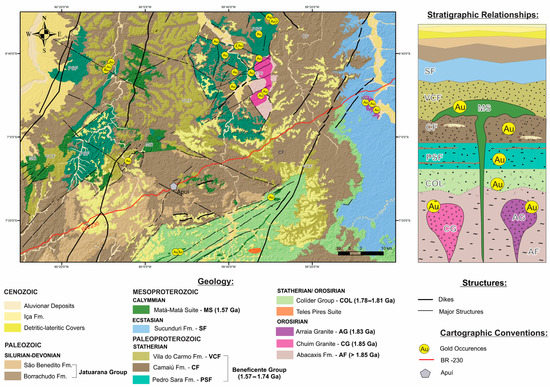 Juma District geological map with the location of gold occurrences, major regional structures, and the main road (BR-230). The stratigraphic relationships section illustrates that gold occurrences are associated with Orosirian to Mesoproterozoic rocks (modified from Meloni et al. [18]). Abbreviation: Fm.—formation.