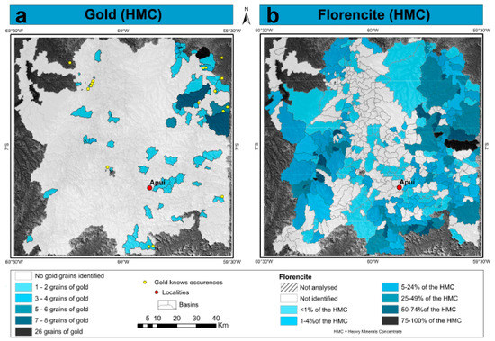 Spatial distributions for heavy mineral concentrates (HMC) are shown through maps of the corresponding hydrographic basins for each sample; (a) Gold HMC; (b) Florencite HMC.