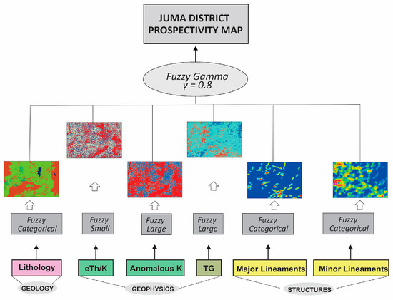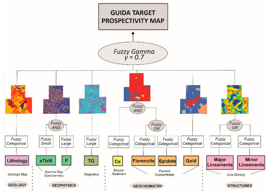 We applied fuzzy systems to produce the Juma District and Guida Target prospectivity maps. Fuzzy logic is a many-valued logic based on the mathematical fuzzy-set theory, initially proposed by [66]. In mineral exploration, this logic has been applied to prospectivity maps, usually in knowledge-driven models. Several geoprocessing techniques were required, including interpolation, raster calculation, image processing, and classification. Then, the fuzzification stage consisted of choosing the most appropriate fuzzy memberships for each layer, i.e., a standardized simplification of different data to allow them to be used together. The pertinence functions used in this work were the fuzzy categorical (in which the expert defines the values to be highlighted), fuzzy small (which highlights the smallest values), and fuzzy large (which highlights the largest values). After this stage, the critical mineralization parameters were transformed into evidential maps using the most appropriate fuzzy operators, resulting in values that vary from 0 (strongly negative evidence) to 1 (strongly positive evidence). We used the operators fuzzy AND, fuzzy OR, and fuzzy Gamma. The fuzzy AND operator is an intersection function whose results tend toward conservative values, while fuzzy OR is a maximum operator that tends toward larger values. The fuzzy Gamma operator combines the fuzzy sum and fuzzy product [67]. Figure 5 and Figure 6 illustrate the steps for Juma District and Guida Target prospectivity modeling.