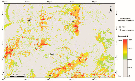 The Juma District prospectivity model delimits regions with the potential to host magmatic–hydrothermal gold and comprises an area of 18,000 km² (Figure 7). The six evidential layers were integrated using the fuzzy Gamma operator (set at γ = 0.8). The prospectivity scores vary from 0 to 0.84, in which the colors range from green to red for the medium to high prospectivity areas (0.39–0.84). The higher values correspond to the most favorable areas to host unknown deposits, as highlighted by warm colors (orange or red). The regions corresponding to lower to medium prospectivity scores (0–0.39) were merged and, as they do not have a prospective expression in our model, we opted to represent them in gray, reducing the search area to 21.7% of the original extension (3906 km²).