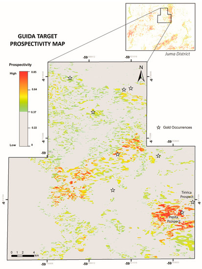 The results highlighted two targets with known gold occurrences: (1) An elongated N–S region in the northern portion of the map where the cluster of occurrences includes the Guida prospect, and the Chuim granite intrusion outcrops in the south of this area. This prospective zone has a characteristic radiometric signature, marked by a high K. Part of this zone has exploratory geochemistry data coverage, which makes it interesting for follow-up studies. For this reason, we delimited a window, adjacent to the Guida prospect, defined as the Guida Target for assessing the new prospectivity model; (2) an elongated NE–SW zone (~70 km extension) in the southeastern map, spatially related to the major shear zone that cuts the Juma District. Some gold occurrences are aligned with this trend, which extends beyond the study area.