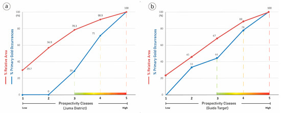 Relative area and gold occurrence percentages plots for the Juma District and Guida Target. The cumulative percentage of primary gold occurrences (blue line) and the cumulative area (red line) for each prospectivity class (1–5); (a) Validation for the Juma District prospectivity map; (b) Validation for the Guida Target prospectivity map.