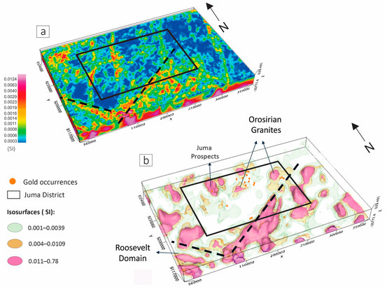 The regional MVI models show: (a) the continuity of the magnetic susceptibility in 3D beyond the Juma District limits; (b) the most relevant regional isosurfaces and the gold occurrences.