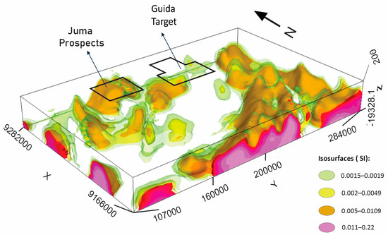 All gold intervals had features indicative of a low-sulfidation magmatic–epithermal origin. Breccias and quartz veins with microcrystalline, drusiform, and lattice-bladed textures affect some of the mineralized intervals. It is possible that in a regional context, these occurrences could be related to distal porphyry-epithermal systems; however, detailed metallogenetic studies are required. Using the integrated analyses of several MVI slices combined with the geologic interpretation, we delimited a magnetic surface, defined as the possible contact between the granite intrusion and the volcano-sedimentary sequences. On the basis of the geophysical and geological model, we considered this contact zone to be favorable to the occurrence of new deposits. Figure 13 shows this geometry, represented by the green isosurface, at a magnetic susceptibility of 0.002 SI (see also Video S1, Supplementary Materials). This surface has compatible magnetic susceptibility values with the average for igneous units, related to the mineralization, as granites (0.0025 SI) [78]. We also considered that the hydrothermal breccias and quartz veins occur preferentially close to the contact with the porphyritic Chuim granite based on the drill core logging results.