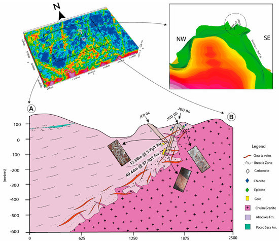 (A) Integrated analysis of drill cores (JED–04, JED–05, and JED–06) and the geophysical model for the Guida prospect. (B) The isosurface delimited by a 0.002 SI susceptibility was interpreted as the possible contact zone between the Chuim Granite and the volcano-sedimentary sequence. Photographs illustrate intervals from drill cores.