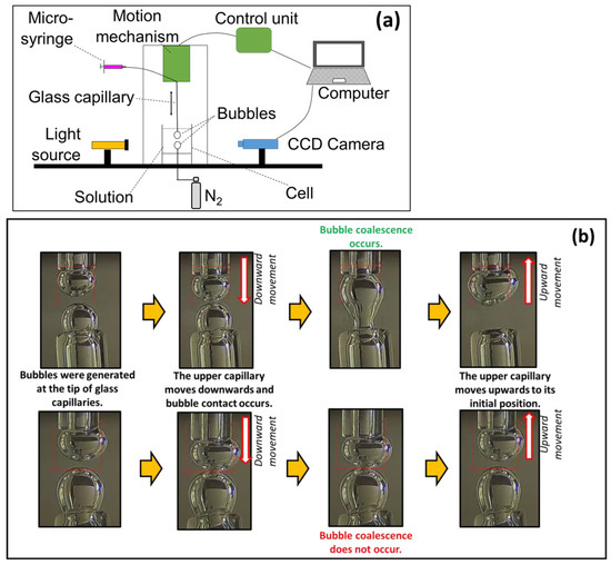 In this study, bubble coalescence time measurements were performed with an induction time test unit (BKT-100, Bratton Engineering, Littleton, MA, USA) [41]. In the experiments, a glass container with a glass capillary tube was filled with the desired solution and placed under the glass capillary tube of the measurement device. Two bubbles of similar size (~2 mm) were formed at the ends of the glass tubes via a micro-syringe. The contact time was set in milliseconds via the computer software. When the device was started, the upper capillary tube moved downwards at 100 mm/s velocity and the two bubbles remained in contact for the specified time. Then, the upper capillary tube returned to its original position. The experimental setup and the sequential processes that occur in bubble coalescence time measurements are shown in Figure 1. The bubble coalescence experiments were carried out with twenty repetitions.