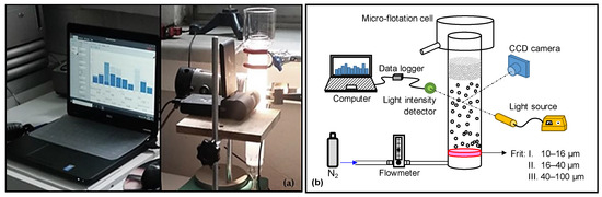The critical coalescence concentration (CCC) is the minimum concentration of a frother that effectively prevents bubbles from coalescing. By determining the CCC value, the optimum concentration of a frother can be selected for a flotation process [43]. In the experiments, the micro-flotation cell was filled with the frother (BG) solution. Then, a light beam was sent through the cell using a cold light source (5100-L, SOIF, Shanghai, China). In this method, while some of the light passing through the column is absorbed by the solution, the intensity (mW) of the light passing through the column was measured by the light intensity detector (S121C, Thorlabs, Newton, NJ, USA) related to the coalescence of the bubbles in the presence of the frother at a constant concentration. Therefore, the CCC of the frother was determined. The experimental setup used in SMD and BSD measurements as well as for the determination of CCC is shown in Figure 2.
