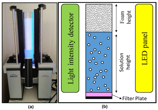 (a) KRÜSS DFA-100 dynamic foam analyzer and (b) the schematic diagram of the system (The bubbles in the system are represented by the blank circles).