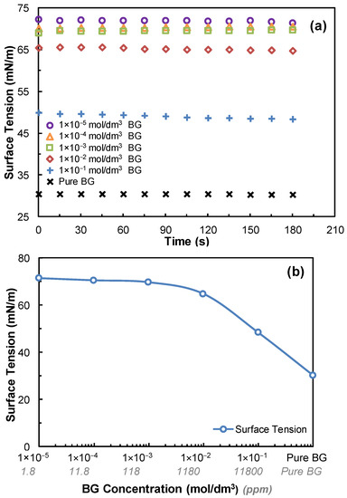 The dynamic surface tensions of aqueous BG solutions (in pure water) were measured for 180 s. Since there was no significant change in surface tension at low BG concentrations, measurements were carried out at higher BG concentrations (1 × 10−5, 1 × 10−4, 1 × 10−3, 1 × 10−2, 1 × 10−1 mol/dm3, and pure BG). The results of the measurements are given in Figure 4 with the equilibrium surface tension profile of BG solutions at 180 s. In Figure 4b, BG concentrations are given both in “ppm” and “mol/dm3” units to compare the results with the other experiments carried out within this study.