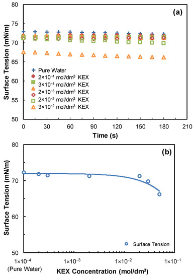 (a) Dynamic surface tension measurement results at various KEX concentrations and (b) equilibrium surface tension values at 180 s with respect to KEX concentration.