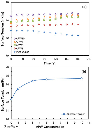 Figure 6a shows that the surface tension of APWs increased slightly with time. Meanwhile, the surface tension also increased with APW concentration, as seen in Figure 6b. While the surface tension is 73.5 mN/m in the presence of APW 1, it increased to 74.4 mN/m in the presence of APW3 and reached a plateau.