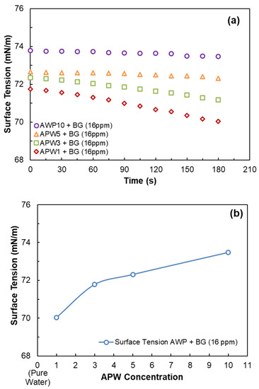 As seen in Figure 7a, although it takes time for BG molecules to reach the interface at low ion concentrations, BG can decrease the surface tension. In the presence of APW1 and BG at 16 ppm, the surface tension decreased from 71.7 mN/m to 70.0 mN/m after 180 s. However, this effect of BG decreased with the ion concentration. In the presence of APW10 and BG (16 ppm), the change in surface tension was only 0.5 mN/m.