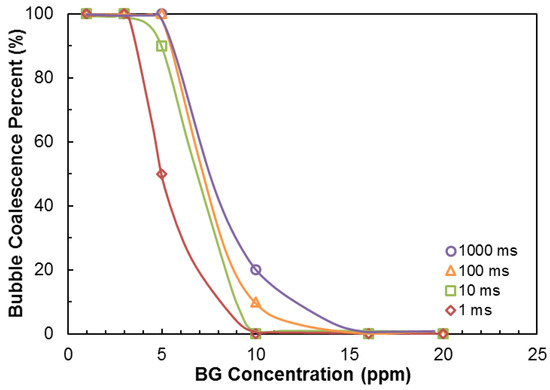 Bubble coalescence percentage as a function of BG concentration is shown in Figure 8 for 1, 10, 100, and 1000 ms contact times.
