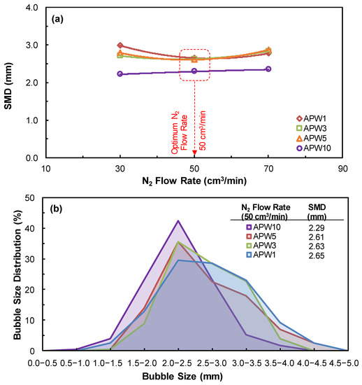 The effect of N2 flow rate (30, 50, and 70 cm3/min) on the SMD of the bubbles was revealed for all APW concentrations (APW1, 3, 5, and 10). As can be seen from the results given in Figure 9a, the lowest SMD values for APW1, 3, and 5 were obtained at 50 cm3/min N2 flow rate, while no significant change was observed in the presence of APW 10. Under these conditions, the optimum N2 flow rate was accepted as 50 cm3/min and was used in further experiments.