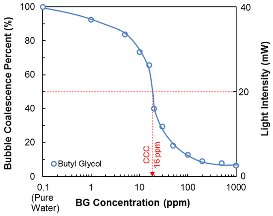 Light intensity and bubble coalescence percent values with respect to BG concentration at 50 cm3/min N2 flow rate (The 50% bubble coalescence percent and the CCC concentration is indicated with the red dotted line).