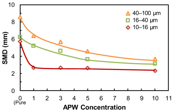 The change in the SMD of the bubbles obtained by using cells with various frit pore sizes (10–16, 16–40, and 40–100 μm) is given in Figure 11 as a function of APW concentration.