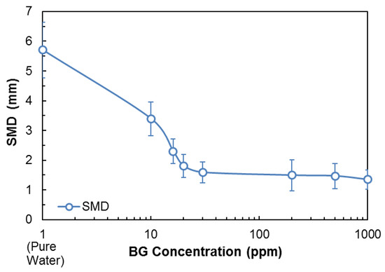 As can be seen in Figure 12, while the SMD is 5.70 mm in the presence of pure water, it decreases with the addition of BG and reaches a plateau around 1.59 mm at 30 ppm BG. Kowalczuk, et al. [56] reported that CCC95 (the concentration giving a 95% reduction in bubble size compared to water only [57]) of BG is 0.236 mmol/dm3, which is equal to 27.89 ppm.