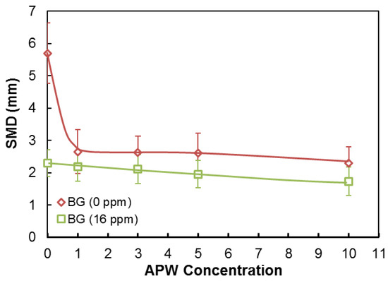 As seen in Figure 13, the presence of dissolved ions in water in the absence of BG causes a rapid decrease in the SMD value. SMD, which is 5.70 mm in pure water, decreased to 2.65 mm in the presence of APW1 and reached a plateau. The SMD was 2.30 mm at 16 ppm BG (CCC value) in the absence of ions. A slight decrease was observed in the SMD in the presence of APW related to APW concentration and it reached 1.73 mm in the presence of APW10.
