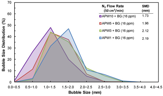 The bubble size distribution obtained at various APW concentrations at a constant N2 flow rate of 50 cm3/min is shown in Figure 9b. As seen in Figure 9b, the results of BSD for APW at various concentrations indicated that the bubbles in the presence of APW1 exhibit a wide size distribution. As the APW concentration increased, finer bubbles were obtained with a narrower size range.