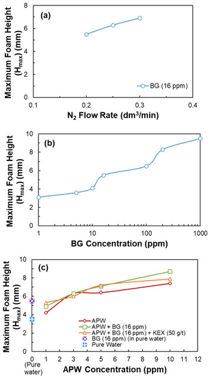 The maximum foam heights (Hmax) obtained in the DFS measurements are given as a function of N2 flow rate, BG, and APW concentrations in Figure 15a–c, respectively.