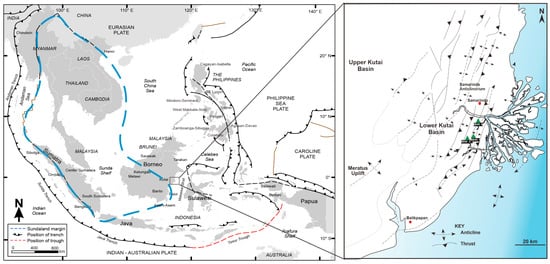 The present-day tectonic elements of Southeast Asia (left) and the tectonic framework of the Lower Kutai Basin (right) (modified after [33,34,37]).
