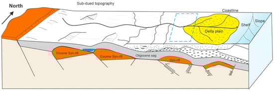 Schematic model for the Middle Miocene to recent deltaic progradation post-inversion facies tract. The blue box indicates the study area. (Modified after [42,46]).