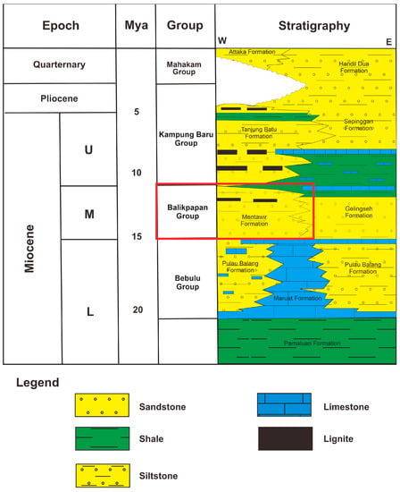 Chronostratigraphic chart for the Lower Miocene to present-day Lower Kutai Basin. This study focused on the Mentawir Formation of the Balikpapan Group (indicated by the red box). The stratigraphy is based on [47].