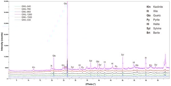 Bulk mineralogy of various Balikpapan Group samples from different depths in well MHK 3, namely, GML 330 (100 m), GML 540 (165 m), GML 780 (240 m), GML 960 (300 m), GML 1260 (385 m), and GML 1500 (460 m).
