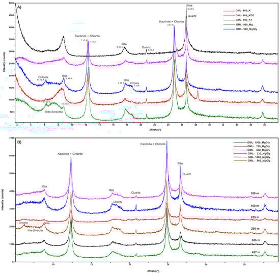 (A) X-ray diffraction patterns of the clay fraction of sample GML 960 (well MHK 3) at the depth of 295 m saturated with Mg, K, Mg, and glycerol, and K and ethylene glycol and heated to 550 °C; (B) X-ray diffraction patterns of all MgGly saturated samples of the Balikpapan Group in well MHK 3.