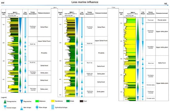 The funnel shape is interpreted as a coarsening upward sequence with sandstones dominating at the top. The sediments in the Balikpapan Group, having the above trends, are suggested to be deposited in progradational settings. The funnel shape further indicates an increasing hydrodynamic energy condition upward [53,62], thus supporting the preservation of organic matter during rapid sedimentation with minimal alteration and oxidation [53]. The bell-shaped log facies in the Balikpapan Group can be interpreted as a fining-upward sequence with fine-grained facies (siltstone and claystone) at the top. The bell shape reflects a retrogradational trend with depositional energy decreasing upwards. A cylindrical shape indicates a sand-dominated, shale-free sequence with sharp upper and lower contacts [53]. Depositional energy is essentially constant, indicating an aggradational pattern of fluvial channels, deltaic distributaries, and tidal sands. It could also point to a slope and fan channel environment [63]; however, this interpretation is not favored here. The least occurring bow shape is defined as a cleaning-upward trend overlaid by a dirtying-upward trend [53]. Medium- to coarse-grained sandstone is overlain and underlain by fine-grained sediments (e.g., claystone). The shape is interpreted to reflect the lower front delta environment.