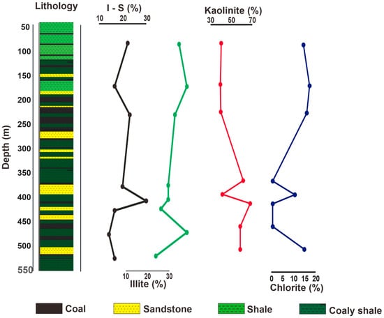 Clay mineral composition of <2 μm fraction of the studied area including mixed layer illite-smectite (black line), illite (green line), kaolinite (red line), and chlorite (blue line). Lithological section is from well MHK 3.