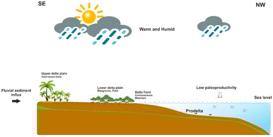 The organic-rich sediments of the Balikpapan Group were deposited during the Miocene in a hot and humid climate. These paleoclimate conditions contributed to the preservation of organic matter as a result of the basin’s abundant terrestrial higher plant material production (Figure 11). Paleoclimate reconstructions and chronostratigraphic correlations indicate that deposition began in the latest Early Miocene and culminated during the Middle Miocene Climatic Optimum (MMCO) [44,76,77]. During the following global sea-level fall at 13.8 Ma, the delta mainly prograded and estimate the end-MMCO sea-level fall at 40–60 m, which would have driven or helped to establish a strong progradational delta succession and the change from a marine-influenced delta-front to more brackish to fluvial conditions.