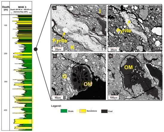 SEM images (backscattered electron images) of sample GML 600 (depth 185 m) from well MHK 3; (A) pyrite and quartz, clay minerals, and clay matrix; (B) platy euhedral kaolinite, fibrous illite, and mica, (C) woody organic matter (type III kerogen) and organic matter; (D) organic matter (Funginite)-hosted pores and embedded minerals (quartz).