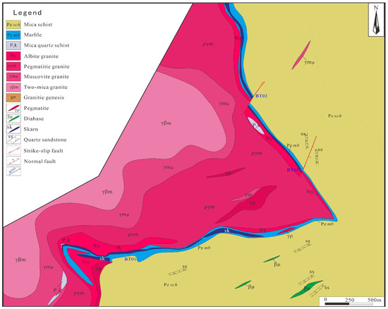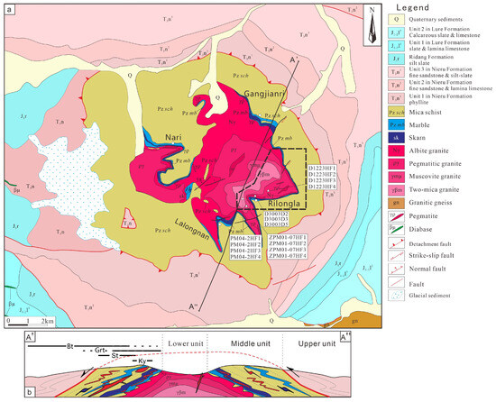 The Lalong Dome consists of three lithologic–tectonic units from the inner to outer: the lower unit (the core), and the middle and upper units (cover rocks) (Figure 2a,b, Figure 3 and Figure 4A). The arc-shaped upper detachment fault is the boundary between the middle unit and upper unit, while the lower detachment fault is not well exposed in the Lalong Dome, which is characterized by the sheath fold around the core of the Lalong Dome. The lower unit consists of a set of the Cenozoic highly fractional crystallization leucogranites, from the core to the rim (Figure 3), including two-mica granite, muscovite granite, albite granite (Figure 4G), and pegmatite (Figure 4F,H,I). The Be–Nb–Ta rare metal ore bodies are mostly hosted by albite granite and pegmatite. The middle unit is commonly known as the detachment system, which has been interpreted as the northern part of the STDS [36,40]. Leucogranites in the lower unit partly intruded into the middle unit, and the boundary between the middle unit and lower unit is always serrated, irregular, and arc-shaped. The middle unit mainly consists of strongly deformed mica schist (Figure 4), leucogranite, pegmatite, skarn (Figure 4D,E), and marble. The typical metamorphic minerals include kyanite, staurolite (Figure 4C), garnet, and biotite. The metamorphic grade decreases from core to rim, with a garnet + kyanite zone, a garnet + staurolite zone, and a biotite + garnet zone. These metasedimentary rocks in the middle unit preserve typical Barrovian peak metamorphism defined by mineral assemblages [22]. The skarn is dominated by calc-silicate minerals such as diopside, andradite and grossular. The main minerals in the skarns close to granite and pegmatite are quartz, albite, epidote, and calcite, which represent an internal skarn zone. Closer to the marble, the minerals comprise diopside, andradite–grossular, wollastonite, chlorite, actinolite, idocrase, phenacite, calcite, and fluorite, which represent an external skarn zone. The skarn-type Be–Na–Ta rare metal ore bodies are hosted by skarns in the middle unit of the Lalong Dome. On the other hand, albite granites and pegmatites in the middle unit of the dome are the lenticular and vein, with length ranging from 2 m to 200 m, and width from 1 m to 20 m. These albite granites and pegmatites are also the host rocks for the Be–Nb–Ta rare metal ore bodies. The upper unit, commonly known as the cover rocks, consists of phyllite, phyllitic slate (Figure 4B), and siltstone. The typical metamorphic minerals in this unit are cordierite, chloritoid (Figure 4B), and andalusite. The metamorphic grade within this unit decreases upsection from low metamorphic phyllite and phyllitic slate to unmetamorphosed sandstone and siltstone at the top.