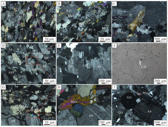 Photomicrographs of leucogranite samples in the Lalong Dome. (A) Photomicrograph of two-mica granite in cross-polarized light. (B) Photomicrograph of muscovite granite in cross-polarized light. (C) Photomicrograph of muscovite granite in cross-polarized light. (D,E) Photomicrograph of albite granite in cross-polarized light. (F) Photomicrograph of albite granite in plane-polarized light, showing columbite in albite. (G,H) Photomicrograph of pegmatite in cross-polarized light. (I) Photomicrograph of pegmatite in cross-polarized light, showing quartz inclusions in albite and representing fluid dissolution. Mineral abbreviation: Ab, albite; Kfs, K-feldspar; Pl, plagioclase; Qtz, quartz; Mus, muscovite; Bt, biotite; Grt, garnet; Clf, columbite.