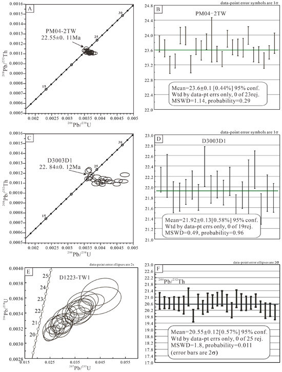 Monazite grains from the leucogranite are light yellow, subhedral–euhedral, mainly short columnar and granular, with length ranging from 60 μm to 150 μm. These monazites generally have no distinct zoning under BSE images. Twenty-four U–Pb analyses in two-mica granite sample PM04-2TW were performed using LA-ICPMS method. From sample PM04-2TW, 23 analysis spots yielded a weighted-mean of 208Pb/232Th age of 23.6 ± 0.1 Ma (1σ; MSWD = 1.1; n = 24) (Figure 7A,B). Twenty-four U–Pb analyses in albite granite sample D3003D1 were performed, and nineteen analysis spots from sample D3003D1 yielded a weighted-mean 208Pb/232Th age of 21.9 ± 0.1 Ma (1σ; MSWD = 0.49; n = 19) (Figure 7C,D). Twenty-five U–Pb analyses in pegmatite sample D1223-TW1 were performed, and twenty-five analysis spots from sample D1223-TW1 yielded a weighted-mean of 208Pb/232Th age of 20.6 ± 0.1 Ma (1σ; MSWD = 1.8; n = 25) (Figure 7E,F).