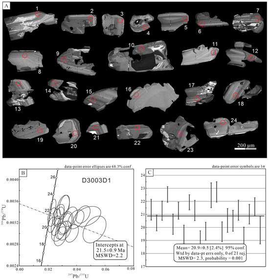 To better constrain for Be–Nb–Ta mineralization of the Lalong deposit, a representative albite granite sample D3003D1 is selected for columbite U–Pb dating. Sample D3003D1 contains subhedral to euhedral CGM grains with lengths ranging from 150 µm to 600 µm that display the typical zoning and complex structures (Figure 8A). The clear oscillatory zoning and complex structures are usually formed in the magmatic stage and the magma–hydrothermal transition stage. Twenty-five U–Pb analyses in albite granite sample D3003D1 were performed, and twenty-one analysis spots from sample D3003D1 yielded a concordant of 206Pb/238U age of 21.5 ± 0.9 Ma (1σ; MSWD = 2.2; n = 21) (Figure 8B) and a weighted-mean of 206Pb/238U age of 20.9 ± 0.5 Ma (1σ; MSWD = 2.3; n = 21) (Figure 8C).