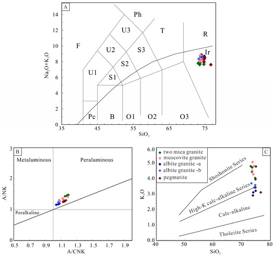 (A) TAS diagram [48] for leucogranites from the Lalong Dome. Pc, Peridotgabbro; B, Gabbro; O1, Gabbroic Diorite; O2, Djorite; O3, Granodiorite; U1, Foid Gabbro; U2, Foid Monzodiorite; U3, Foid Monzosyenite; Ph, Foid Syenite; S1, Monzogabbro; S2, Monzodiorite; S3, Monzonite; Ir, Granite; F, Foidolite. (B) Shand’s index Al/(Na + K) versus Al/(Ca + Na + K) plot [49]. (C) K2O versus SiO2 diagram [50].