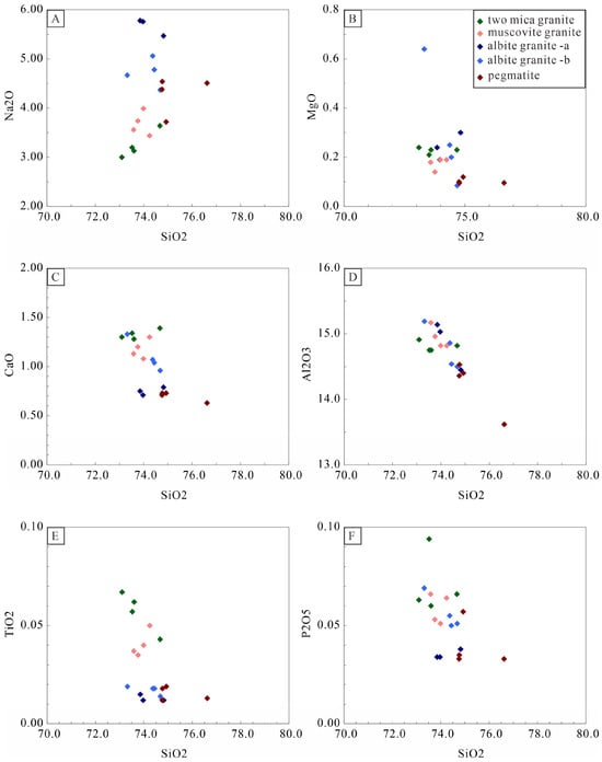 The leucogranite samples in the Lalong Dome fall in the granite field in the TAS classification plot (Figure 9A). Two-mica granites, muscovite granites, albite granites, and pegmatites have high SiO2 contents of 73.1–74.7 wt.%, 73.6–74.2 wt.%, 73.3–74.8 wt.%, and 74.8–76.6 wt.%, respectively. These leucogranitic rocks are peraluminous (Figure 9B) with high Al2O3 content (13.6–15.2 wt.%) and A/CNK [molar Al2O3/(CaO + Na2O + K2O)] (1.02–1.2). Two-mica granites and muscovite granites are characterized by the high-K calc-alkaline series, while albite granites, and pegmatites are calc-alkaline series (Figure 9C). In the Hark diagrams (Figure 10), Na2O content from two-mica granites, muscovite granites to albite granites and pegmatites are gradually increasing with the SiO2 content. MgO, CaO, Al2O3, TiO2, and P2O5 content from two-mica granites, muscovite granites–albite granites, and pegmatites gradually decrease with the SiO2 content increase.