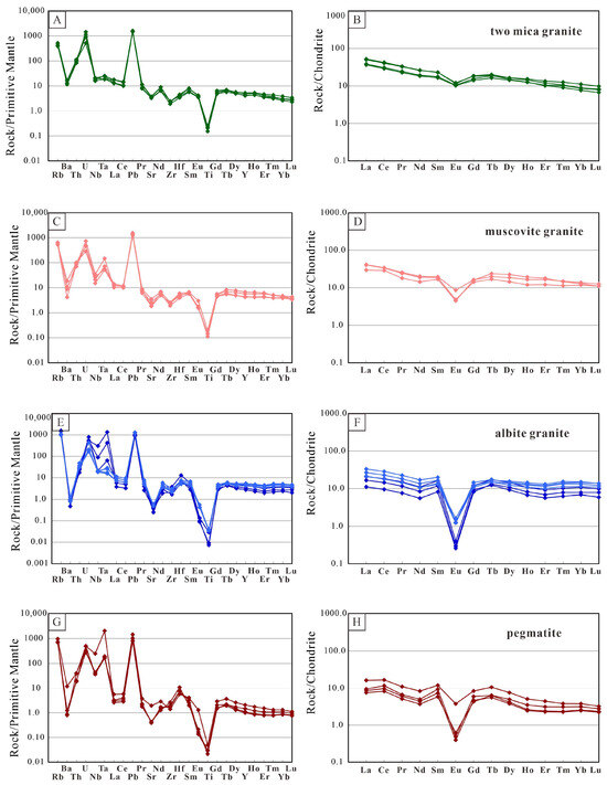 Primitive mantle-normalized spider diagrams (A,C,E,G) and chondrite-normalized REE patterns (B,D,F,H) for leucogranites in the Lalong Dome, respectively.