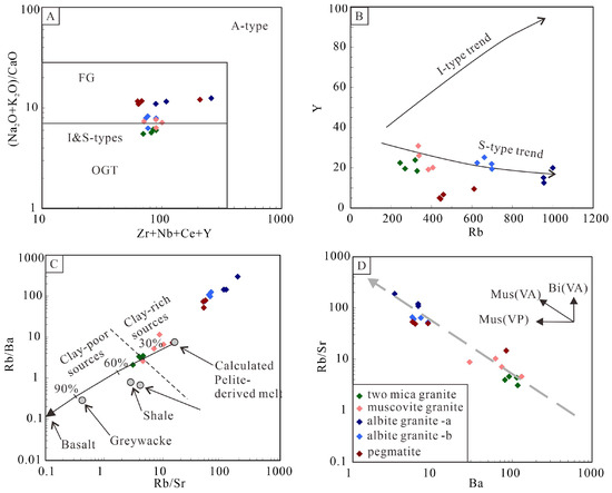 (A) Zr + Nb + Ce + Y versus (Na2O + K2O)/CaO showing A-type granites and fields for fractionated felsic granites (FG) and unfractionated M-, I- and S-type granites (OGT); the coordinates of these fields are X = 350, Y = 4 and 16 (A) [66]. (B) Y vs. Rb diagram [67]. (C) Rb/Sr vs. Rb/Ba plots of the granitic rocks [68]. (D) Ba–Rb/Sr diagram. Mus (VP)—muscovite melting alteration in saturated vapor phase; Mus (VA)—muscovite melting alteration without vapor phase; Bi (VA)—biotite melting alteration without vapor phase.