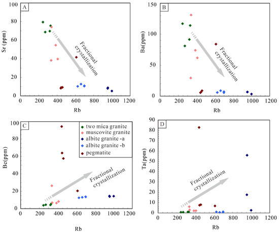 Harker variation diagrams for trace elements, showing fractional crystallization trend. (A) Rb vs. Sr diagram. (B) Rb vs. Ba diagram. (C) Rb vs. Be diagram. (D) Rb vs. Ta diagram.