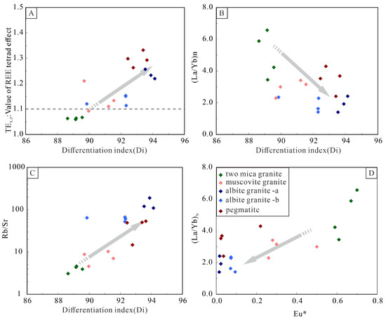 In general, the Lalong leucogranites are enriched in highly incompatible trace elements (LILEs) and depleted in high-field-strength elements (HFSEs). In the primitive mantle-normalized spider grams (Figure 11), leucogranites exhibit similar patterns, and are depleted in Ba, Sr, Zr, and Ti, but enriched in Rb, Pb, Nb, and Ta. Furthermore, their REEs show similar patterns in the chondrite-normalized patterns, featured by negative anomalies of Eu with obvious negative Eu anomalie in albite granites and pegmatites. The term “tetrad effect” refers to the subdivision of the 15 lanthanide elements into four groups in a REE chondrite-normalized distribution pattern: (1) La–Ce–Pr–Nd, (2) Pm–Sm–Eu–Gd, (3) Gd–Tb–Dy–Ho, and (4) Er–Tm–Yb–Lu [51]. The existence of the “tetrad effect” in highly evolved peraluminous magmatic systems is the result of the interaction between the melt and the phase containing volatilization diverge, which is the criterion of the degree of magma differentiation. Albite granites and pegmatites exhibit a significant lanthanide tetrad effect which is confined by the degree of the tetrad effect (TE1,3) that ranges from 1.11 to 1.33. TE1,3 is defined as (TE1 × TE3)0.5, TE1 = (Ce/Ce* × Pr/Pr*)0.5, TE3 = (Tb/Tb* × Dy/Dy*)0.5, Ce* = LaN2/3 × NdN1/3, Pr* = LaN1/3 × NdN2/3, Tb* = GdN2/3 × HoN1/3, Dy* = GdN1/3 × HoN2/3; the subscript N is chondrite-normalized lanthanide concentration [52].