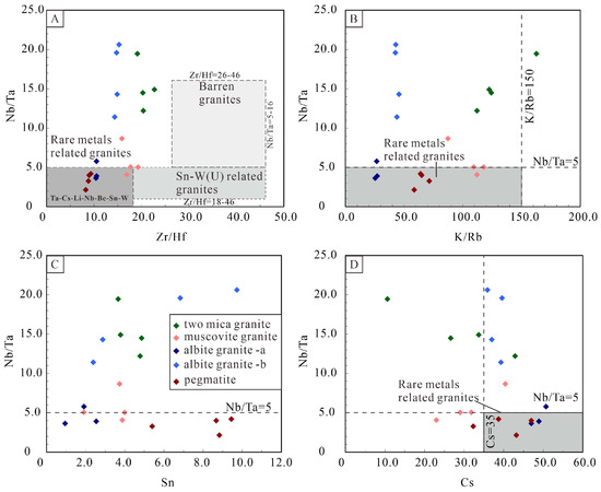 Both the Nb/Ta and K/Rb ratios can be used to identify the metallogenic potential of rare metal granites [6,79]. Nb/Ta < 5 and K/Rb < 150 indicate good metallogenic potential of rare metal granites. The ratios of Nb/Ta and Zr/Hf decreased gradually from two-mica granite, muscovite granite, and albite granite–pegmatite, and the ratios of albite granite and pegmatite were less than 5 and 18, respectively. They fall in the area of rare metal granite (Ta–Cs–Li–Nb–Be–Sn–W) (Figure 16A). In the Nb/Ta–K/Rb diagram, the Nb/Ta and K/Rb ratios of albite granite and pegmatite are less than 5 and 150, respectively, indicating that albite granite and pegmatite belong to rare metal granites and have excellent potential for rare metal mineralization (Figure 16B). In addition, from two-mica granite, muscovite granite, and albite granite–pegmatite, Sn and Cs content in these leucogranites gradually increase with the decrease in the Nb/Ta ratio, also showing that the mineralization potential of rare metal increases gradually with the increase in crystallization differentiation, and the potential of albitite granite and pegmatite is the highest (Figure 16C,D).